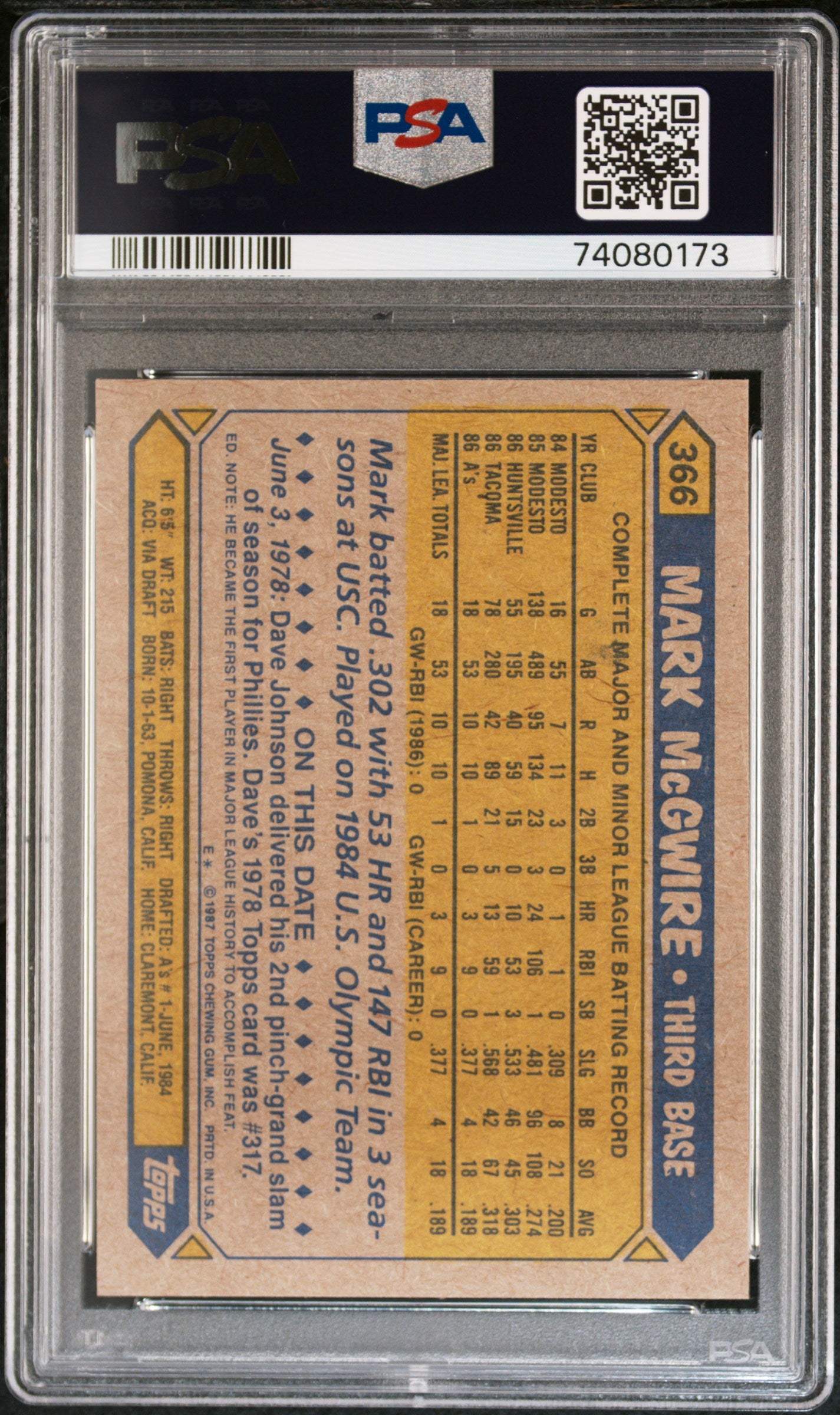 | *This is a Single Trading Card* | *Discounts are not available on Single Trading Cards* | This is a nice example of a 1987 Topps #366 Mark Mcgwire PSA 9 MINT. Please check out our other listings for more great cards. Thank you for your interest in one of our cards!!! Prior to making any bids/purchases, I would kindly ask you to read the information below: Item Condition Please see the provided pictures for the condition of the card or item, pictures of the front and back are provided for your review. We cannot accommodate requests for additional pictures. Any notable flaws or damage to this item will be noted in this listing. Please use the attached photos provided for your own assessment. Graded card cases may come with some minor wear/tear, surface scratch, chipped, or blemish. There are no partial refunds or returns because of the case condition. All single cards will come in protective cases. If you purchase a listing that's sold as a lot it may come in snap cases or sealed in a team bag, and not all cards will be individually sleeved and top loaded in all lots. Raw cards are sold as such, with no guarantees of potential and/or expected grades. All cards are sold as is, with no returns or refunds. Listed With Mascot.