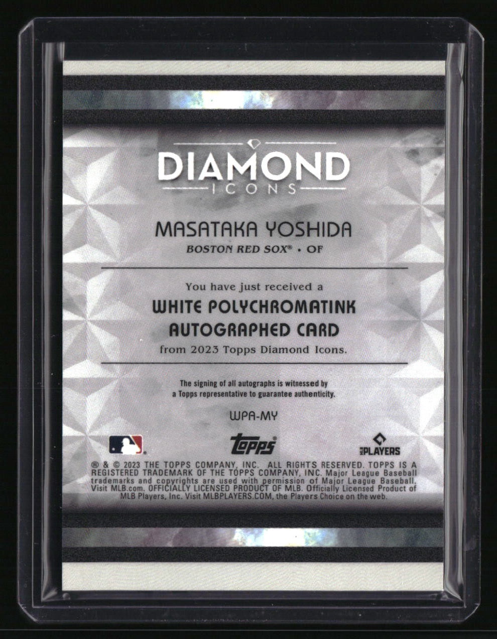 | *This is a Single Trading Card* | *Discounts are not available on Single Trading Cards* | This is a nice example of a 2023 Topps Diamond Icons - PolychromatINK White Auto #WPA-MY Masataka Yoshida SN,AU. Please check out our other listings for more great cards. Thank you for your interest in one of our cards!!! Prior to making any bids/purchases, I would kindly ask you to read the information below: Item Condition Please see the provided pictures for the condition of the card or item, pictures of the front and back are provided for your review. We cannot accommodate requests for additional pictures. Any notable flaws or damage to this item will be noted in this listing. Please use the attached photos provided for your own assessment. Graded card cases may come with some minor wear/tear, surface scratch, chipped, or blemish. There are no partial refunds or returns because of the case condition. All single cards will come in protective cases. If you purchase a listing that's sold as a lot it may come in snap cases or sealed in a team bag, and not all cards will be individually sleeved and top loaded in all lots. Raw cards are sold as such, with no guarantees of potential and/or expected grades. All cards are sold as is, with no returns or refunds. Listed With Mascot.