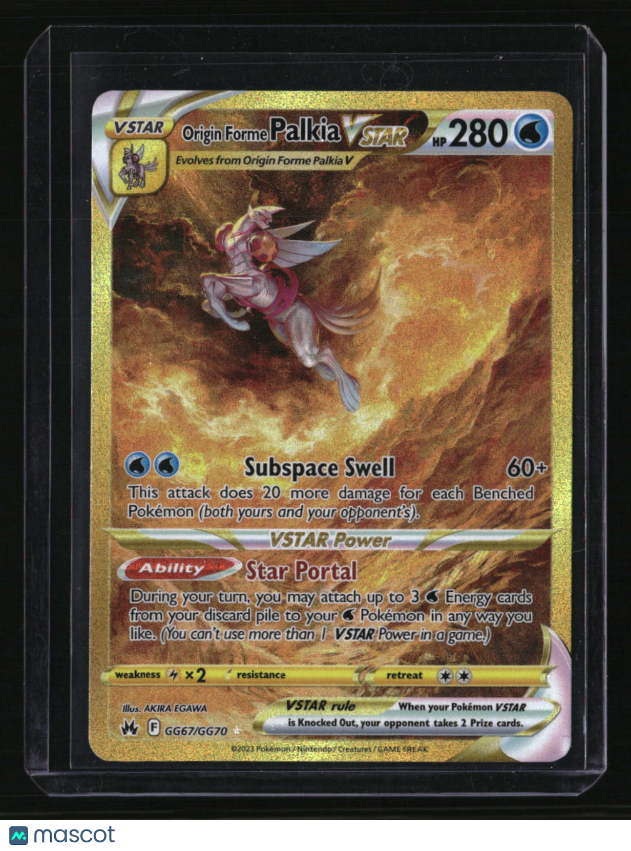 | *This is a Single Trading Card* | *Discounts are not available on Single Trading Cards* | This is a nice example of a Crown Zenith: Galarian Gallery #GG67/GG70 Origin Forme Palkia VSTAR (Secret) Secret Rare. Please check out our other listings for more great cards. Thank you for your interest in one of our cards!!! Prior to making any bids/purchases, I would kindly ask you to read the information below: Item Condition Please see the provided pictures for the condition of the card or item, pictures of the front and back are provided for your review. We cannot accommodate requests for additional pictures. Any notable flaws or damage to this item will be noted in this listing. Please use the attached photos provided for your own assessment. Graded card cases may come with some minor wear/tear, surface scratch, chipped, or blemish. There are no partial refunds or returns because of the case condition. All single cards will come in protective cases. If you purchase a listing that's sold as a lot it may come in snap cases or sealed in a team bag, and not all cards will be individually sleeved and top loaded in all lots. Raw cards are sold as such, with no guarantees of potential and/or expected grades. All cards are sold as is, with no returns or refunds. Listed With Mascot.