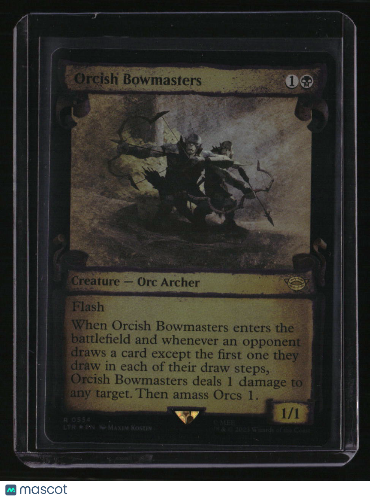 | *This is a Single Trading Card* | *Discounts are not available on Single Trading Cards* | This is a nice example of a Universes Beyond: The Lord of the Rings: Tales of Middle-earth #554 Orcish Bowmasters (Showcase Scrolls) Rare. Please check out our other listings for more great cards. Thank you for your interest in one of our cards!!! Prior to making any bids/purchases, I would kindly ask you to read the information below: Item Condition Please see the provided pictures for the condition of the card or item, pictures of the front and back are provided for your review. We cannot accommodate requests for additional pictures. Any notable flaws or damage to this item will be noted in this listing. Please use the attached photos provided for your own assessment. Graded card cases may come with some minor wear/tear, surface scratch, chipped, or blemish. There are no partial refunds or returns because of the case condition. All single cards will come in protective cases. If you purchase a listing that's sold as a lot it may come in snap cases or sealed in a team bag, and not all cards will be individually sleeved and top loaded in all lots. Raw cards are sold as such, with no guarantees of potential and/or expected grades. All cards are sold as is, with no returns or refunds. Listed With Mascot.