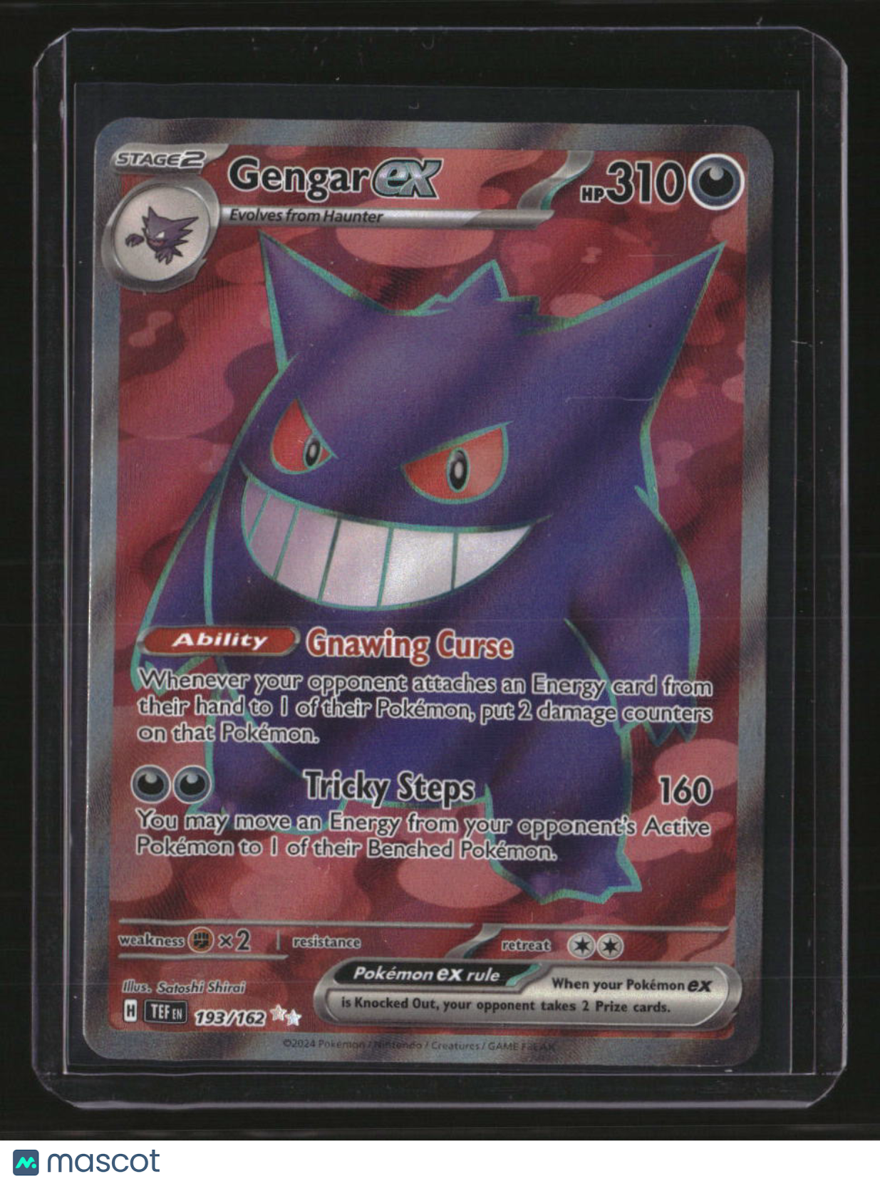 | *This is a Single Trading Card* | *Discounts are not available on Single Trading Cards* | This is a nice example of a SV05: Temporal Forces #193/162 Gengar ex Ultra Rare. Please check out our other listings for more great cards. Thank you for your interest in one of our cards!!! Prior to making any bids/purchases, I would kindly ask you to read the information below: Item Condition Please see the provided pictures for the condition of the card or item, pictures of the front and back are provided for your review. We cannot accommodate requests for additional pictures. Any notable flaws or damage to this item will be noted in this listing. Please use the attached photos provided for your own assessment. Graded card cases may come with some minor wear/tear, surface scratch, chipped, or blemish. There are no partial refunds or returns because of the case condition. All single cards will come in protective cases. If you purchase a listing that's sold as a lot it may come in snap cases or sealed in a team bag, and not all cards will be individually sleeved and top loaded in all lots. Raw cards are sold as such, with no guarantees of potential and/or expected grades. All cards are sold as is, with no returns or refunds. Listed With Mascot.