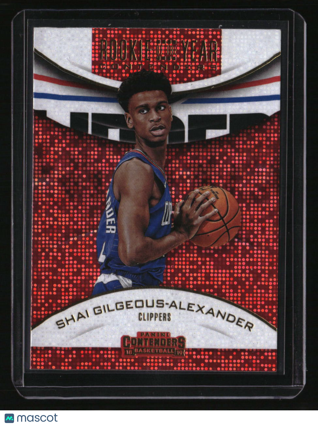 | *This is a Single Trading Card* | *Discounts are not available on Single Trading Cards* | This is a nice example of a 2018-19 Panini Contenders #11 Shai Gilgeous-Alexander Rookie of the Year Contenders . Please check out our other listings for more great cards. Thank you for your interest in one of our cards!!! Prior to making any bids/purchases, I would kindly ask you to read the information below: Item Condition Please see the provided pictures for the condition of the card or item, pictures of the front and back are provided for your review. We cannot accommodate requests for additional pictures. Any notable flaws or damage to this item will be noted in this listing. Please use the attached photos provided for your own assessment. Graded card cases may come with some minor wear/tear, surface scratch, chipped, or blemish. There are no partial refunds or returns because of the case condition. All single cards will come in protective cases. If you purchase a listing that's sold as a lot it may come in snap cases or sealed in a team bag, and not all cards will be individually sleeved and top loaded in all lots. Raw cards are sold as such, with no guarantees of potential and/or expected grades. All cards are sold as is, with no returns or refunds. Listed With Mascot.