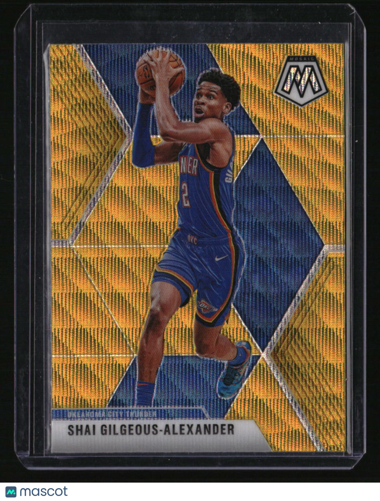 | *This is a Single Trading Card* | *Discounts are not available on Single Trading Cards* | This is a nice example of a 2019-20 Panini Mosaic #133 Shai Gilgeous-Alexander Gold Wave Prizm . Please check out our other listings for more great cards. Thank you for your interest in one of our cards!!! Prior to making any bids/purchases, I would kindly ask you to read the information below: Item Condition Please see the provided pictures for the condition of the card or item, pictures of the front and back are provided for your review. We cannot accommodate requests for additional pictures. Any notable flaws or damage to this item will be noted in this listing. Please use the attached photos provided for your own assessment. Graded card cases may come with some minor wear/tear, surface scratch, chipped, or blemish. There are no partial refunds or returns because of the case condition. All single cards will come in protective cases. If you purchase a listing that's sold as a lot it may come in snap cases or sealed in a team bag, and not all cards will be individually sleeved and top loaded in all lots. Raw cards are sold as such, with no guarantees of potential and/or expected grades. All cards are sold as is, with no returns or refunds. Listed With Mascot.