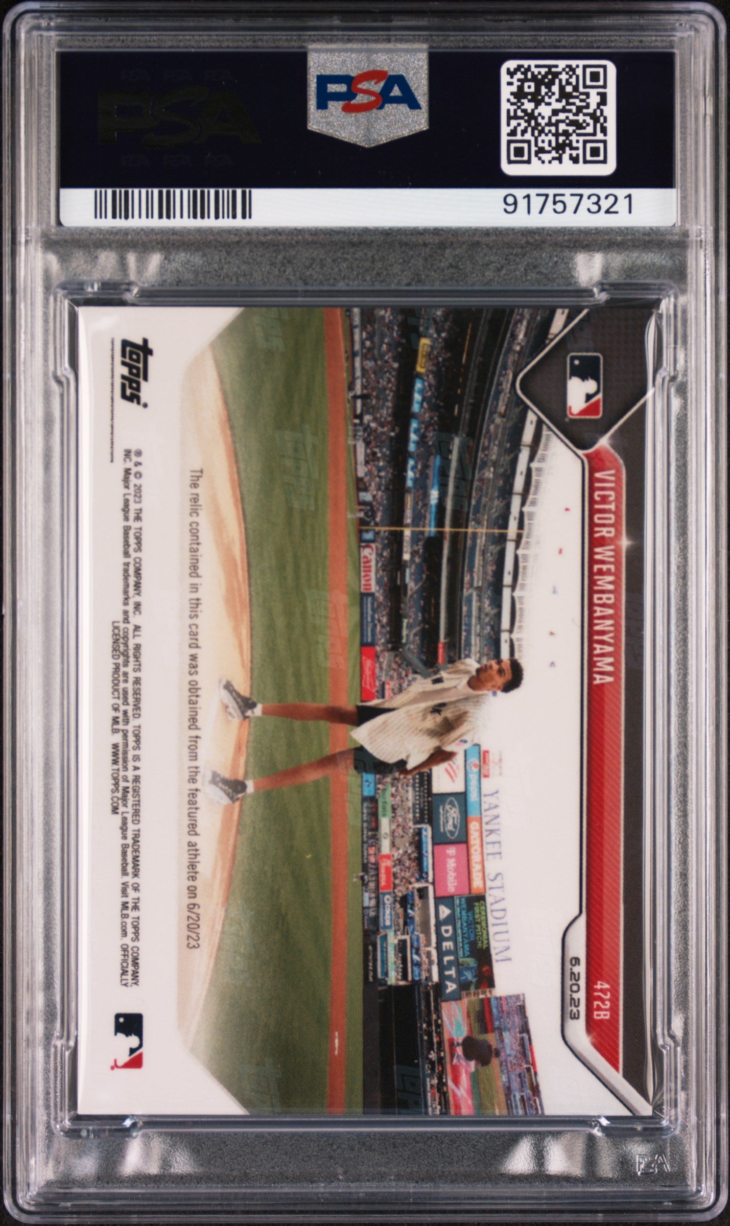 | *This is a Single Trading Card* | *Discounts are not available on Single Trading Cards* | This is a nice example of a 2023 Topps Now #472B Victor Wembanyama Event-Worn Jsy Relic-White PSA 9 MINT. Please check out our other listings for more great cards. Thank you for your interest in one of our cards!!! Prior to making any bids/purchases, I would kindly ask you to read the information below: Item Condition Please see the provided pictures for the condition of the card or item, pictures of the front and back are provided for your review. We cannot accommodate requests for additional pictures. Any notable flaws or damage to this item will be noted in this listing. Please use the attached photos provided for your own assessment. Graded card cases may come with some minor wear/tear, surface scratch, chipped, or blemish. There are no partial refunds or returns because of the case condition. All single cards will come in protective cases. If you purchase a listing that's sold as a lot it may come in snap cases or sealed in a team bag, and not all cards will be individually sleeved and top loaded in all lots. Raw cards are sold as such, with no guarantees of potential and/or expected grades. All cards are sold as is, with no returns or refunds. Listed With Mascot.
