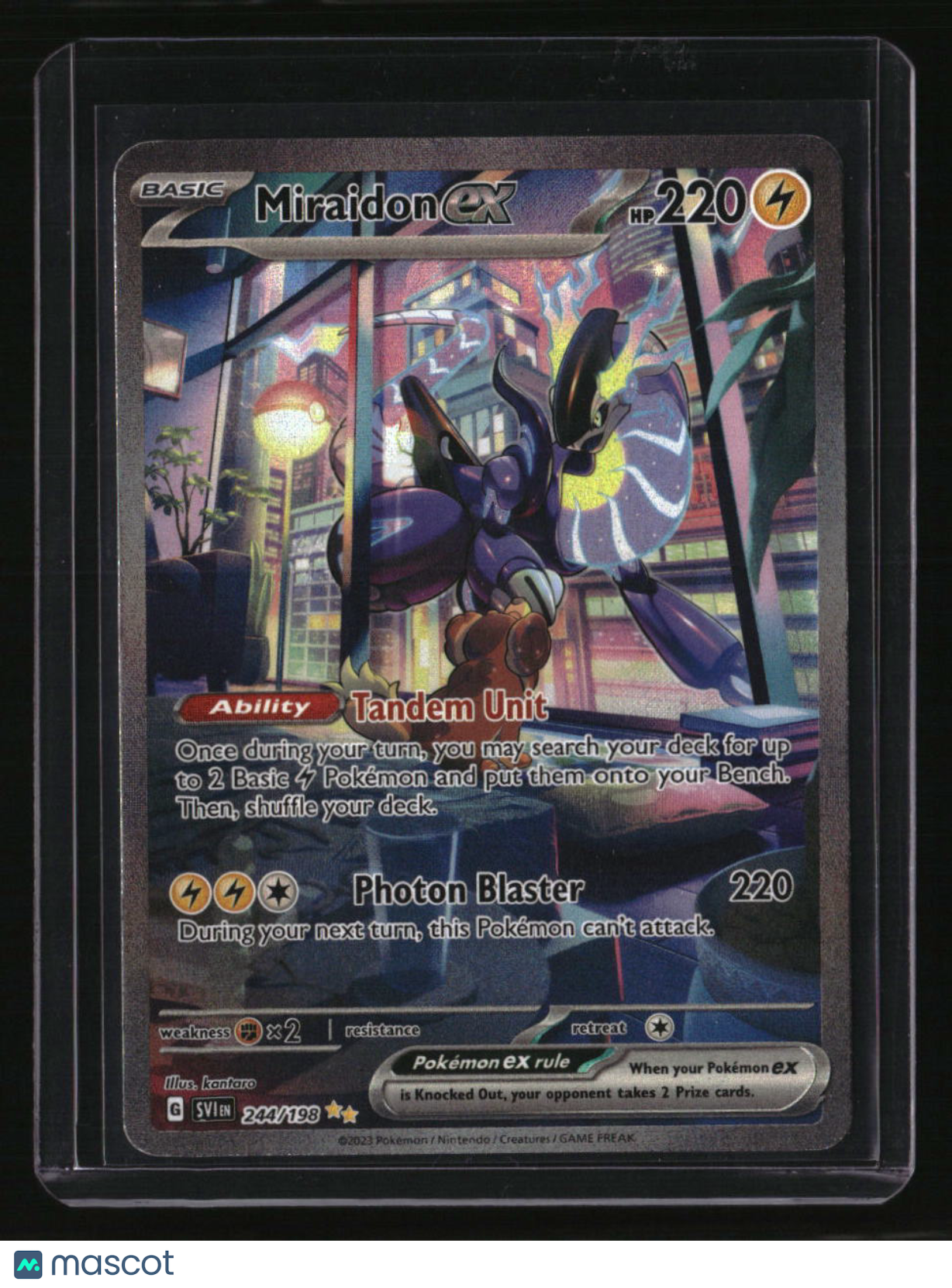 | *This is a Single Trading Card* | *Discounts are not available on Single Trading Cards* | This is a nice example of a SV01: Scarlet & Violet Base Set #244/198 Miraidon ex . Please check out our other listings for more great cards. Thank you for your interest in one of our cards!!! Prior to making any bids/purchases, I would kindly ask you to read the information below: Item Condition Please see the provided pictures for the condition of the card or item, pictures of the front and back are provided for your review. We cannot accommodate requests for additional pictures. Any notable flaws or damage to this item will be noted in this listing. Please use the attached photos provided for your own assessment. Graded card cases may come with some minor wear/tear, surface scratch, chipped, or blemish. There are no partial refunds or returns because of the case condition. All single cards will come in protective cases. If you purchase a listing that's sold as a lot it may come in snap cases or sealed in a team bag, and not all cards will be individually sleeved and top loaded in all lots. Raw cards are sold as such, with no guarantees of potential and/or expected grades. All cards are sold as is, with no returns or refunds. Listed With Mascot.
