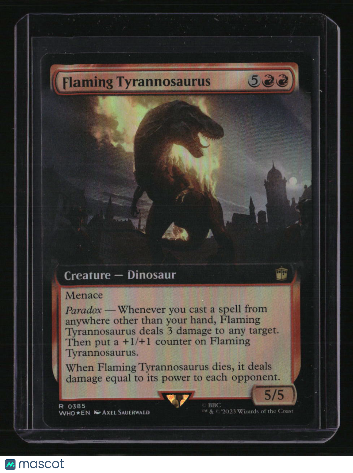 | *This is a Single Trading Card* | *Discounts are not available on Single Trading Cards* | This is a nice example of a Universes Beyond: Doctor Who #385 Flaming Tyrannosaurus (Extended Art) Rare. Please check out our other listings for more great cards. Thank you for your interest in one of our cards!!! Prior to making any bids/purchases, I would kindly ask you to read the information below: Item Condition Please see the provided pictures for the condition of the card or item, pictures of the front and back are provided for your review. We cannot accommodate requests for additional pictures. Any notable flaws or damage to this item will be noted in this listing. Please use the attached photos provided for your own assessment. Graded card cases may come with some minor wear/tear, surface scratch, chipped, or blemish. There are no partial refunds or returns because of the case condition. All single cards will come in protective cases. If you purchase a listing that's sold as a lot it may come in snap cases or sealed in a team bag, and not all cards will be individually sleeved and top loaded in all lots. Raw cards are sold as such, with no guarantees of potential and/or expected grades. All cards are sold as is, with no returns or refunds. Listed With Mascot.