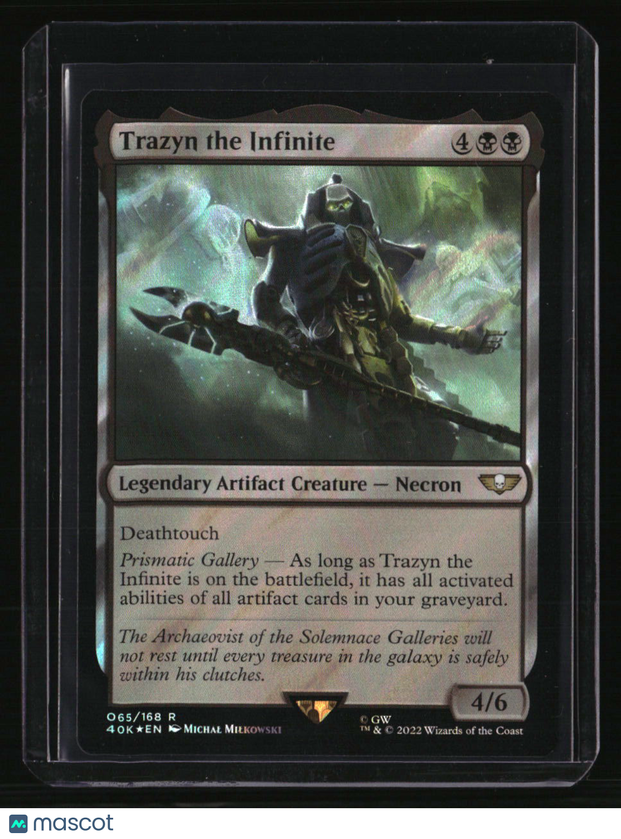 | *This is a Single Trading Card* | *Discounts are not available on Single Trading Cards* | This is a nice example of a Universes Beyond: Warhammer 40,000 #65 Trazyn the Infinite (Surge Foil) Rare. Please check out our other listings for more great cards. Thank you for your interest in one of our cards!!! Prior to making any bids/purchases, I would kindly ask you to read the information below: Item Condition Please see the provided pictures for the condition of the card or item, pictures of the front and back are provided for your review. We cannot accommodate requests for additional pictures. Any notable flaws or damage to this item will be noted in this listing. Please use the attached photos provided for your own assessment. Graded card cases may come with some minor wear/tear, surface scratch, chipped, or blemish. There are no partial refunds or returns because of the case condition. All single cards will come in protective cases. If you purchase a listing that's sold as a lot it may come in snap cases or sealed in a team bag, and not all cards will be individually sleeved and top loaded in all lots. Raw cards are sold as such, with no guarantees of potential and/or expected grades. All cards are sold as is, with no returns or refunds. Listed With Mascot.