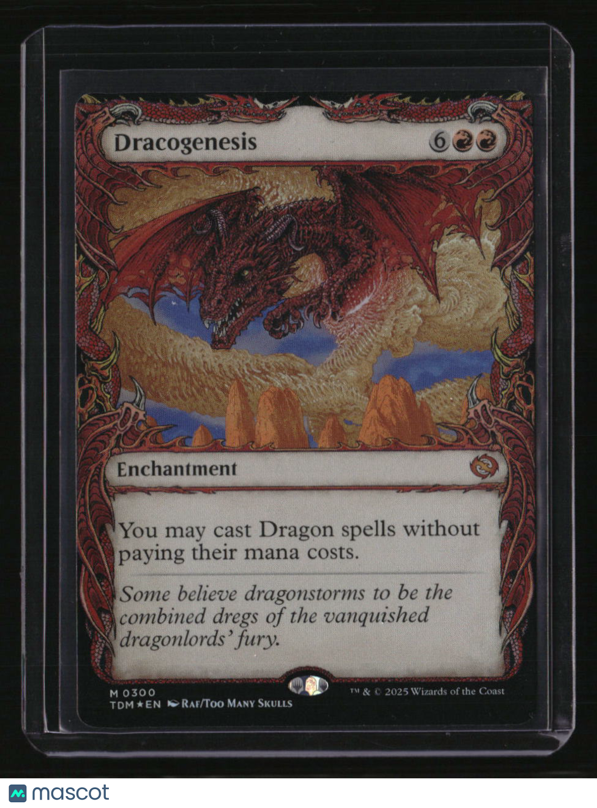 | *This is a Single Trading Card* | *Discounts are not available on Single Trading Cards* | This is a nice example of a Tarkir: Dragonstorm #300 Dracogenesis (0300) (Showcase) Mythic. Please check out our other listings for more great cards. Thank you for your interest in one of our cards!!! Prior to making any bids/purchases, I would kindly ask you to read the information below: Item Condition Please see the provided pictures for the condition of the card or item, pictures of the front and back are provided for your review. We cannot accommodate requests for additional pictures. Any notable flaws or damage to this item will be noted in this listing. Please use the attached photos provided for your own assessment. Graded card cases may come with some minor wear/tear, surface scratch, chipped, or blemish. There are no partial refunds or returns because of the case condition. All single cards will come in protective cases. If you purchase a listing that's sold as a lot it may come in snap cases or sealed in a team bag, and not all cards will be individually sleeved and top loaded in all lots. Raw cards are sold as such, with no guarantees of potential and/or expected grades. All cards are sold as is, with no returns or refunds. Listed With Mascot.