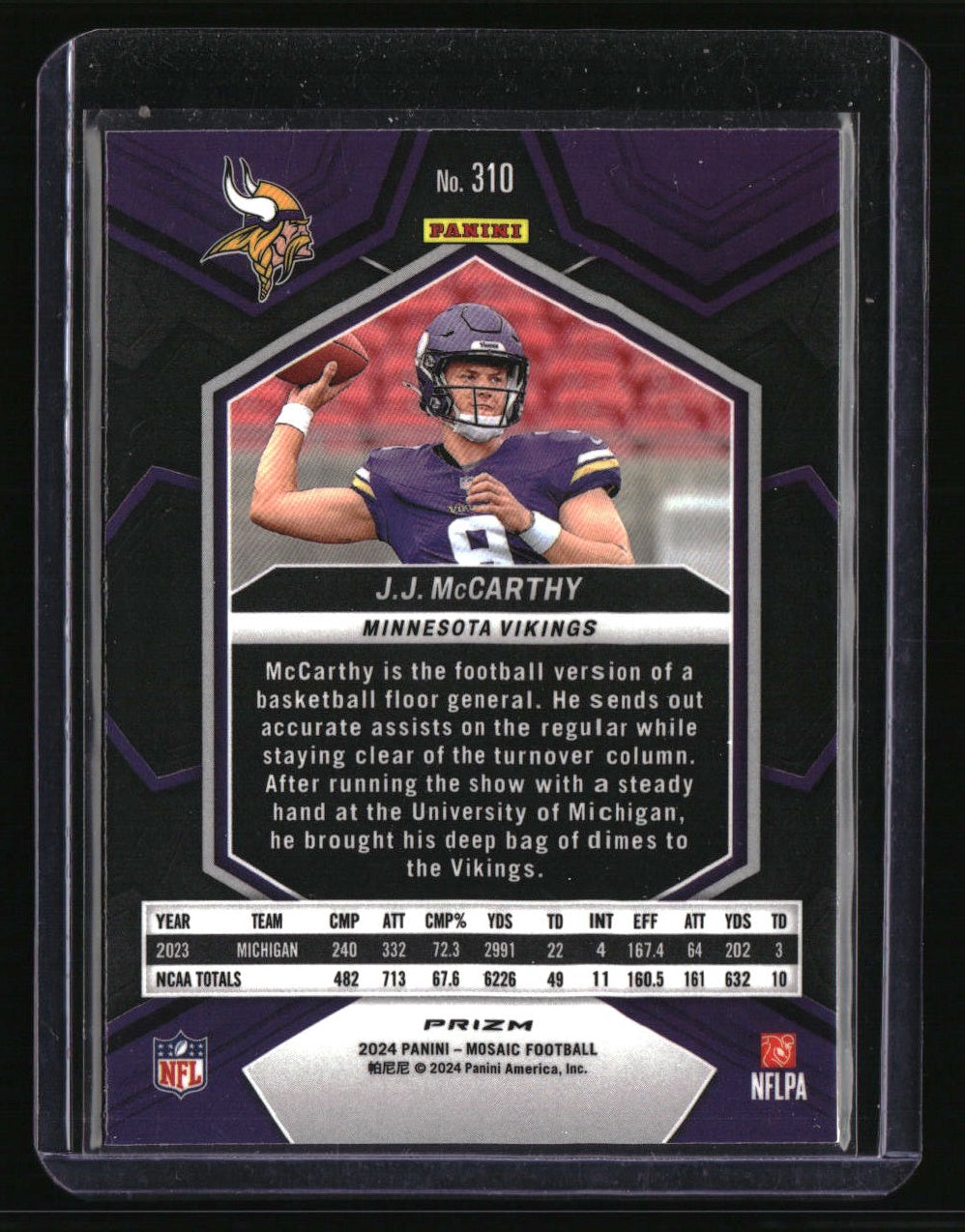 | *This is a Single Trading Card* | *Discounts are not available on Single Trading Cards* | This is a nice example of a 2024 Panini Mosaic #310 J.J. McCarthy Mosaic Camo Red . Please check out our other listings for more great cards. Thank you for your interest in one of our cards!!! Prior to making any bids/purchases, I would kindly ask you to read the information below: Item Condition Please see the provided pictures for the condition of the card or item, pictures of the front and back are provided for your review. We cannot accommodate requests for additional pictures. Any notable flaws or damage to this item will be noted in this listing. Please use the attached photos provided for your own assessment. Graded card cases may come with some minor wear/tear, surface scratch, chipped, or blemish. There are no partial refunds or returns because of the case condition. All single cards will come in protective cases. If you purchase a listing that's sold as a lot it may come in snap cases or sealed in a team bag, and not all cards will be individually sleeved and top loaded in all lots. Raw cards are sold as such, with no guarantees of potential and/or expected grades. All cards are sold as is, with no returns or refunds. Listed With Mascot.