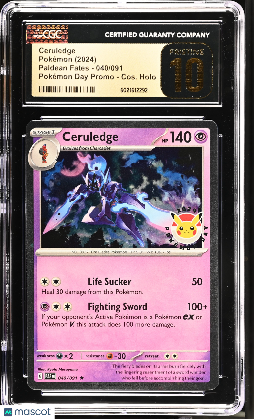 | *This is a Single Trading Card* | *Discounts are not available on Single Trading Cards* | This is a nice example of a 2024 Paldean Fates #040/091 Ceruledge CGC 10 Pokémon Day PromoPRISTINE. Please check out our other listings for more great cards. Thank you for your interest in one of our cards!!! Prior to making any bids/purchases, I would kindly ask you to read the information below: Item Condition Please see the provided pictures for the condition of the card or item, pictures of the front and back are provided for your review. We cannot accommodate requests for additional pictures. Any notable flaws or damage to this item will be noted in this listing. Please use the attached photos provided for your own assessment. Graded card cases may come with some minor wear/tear, surface scratch, chipped, or blemish. There are no partial refunds or returns because of the case condition. All single cards will come in protective cases. If you purchase a listing that's sold as a lot it may come in snap cases or sealed in a team bag, and not all cards will be individually sleeved and top loaded in all lots. Raw cards are sold as such, with no guarantees of potential and/or expected grades. All cards are sold as is, with no returns or refunds. Listed With Mascot.