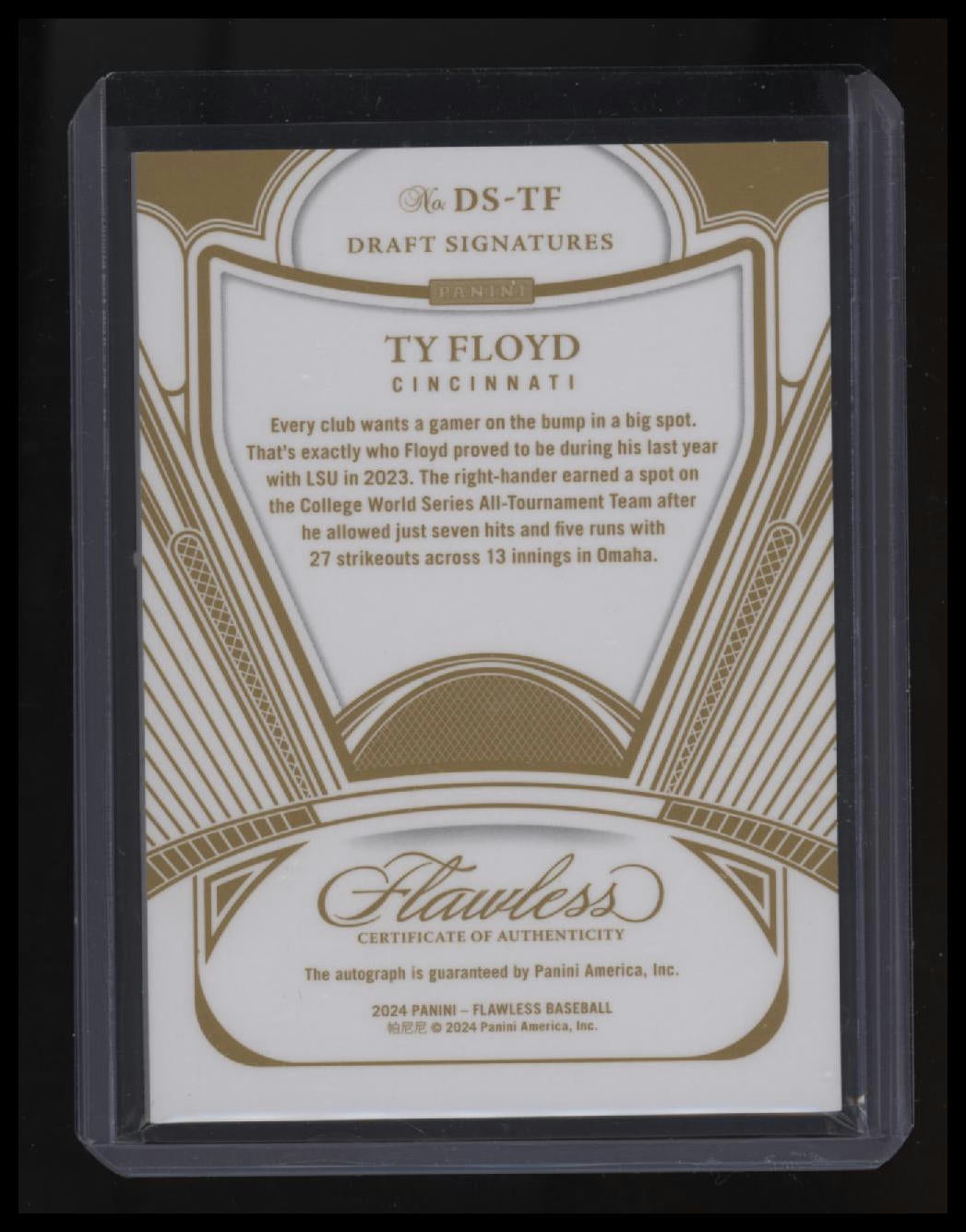 | *This is a Single Trading Card* | *Discounts are not available on Single Trading Cards* | This is a nice example of a 2024 Panini Flawless #DS-TF Ty Floyd Draft Signature Emerald SN,AU. Please check out our other listings for more great cards. Thank you for your interest in one of our cards!!! Prior to making any bids/purchases, I would kindly ask you to read the information below: Item Condition Please see the provided pictures for the condition of the card or item, pictures of the front and back are provided for your review. We cannot accommodate requests for additional pictures. Any notable flaws or damage to this item will be noted in this listing. Please use the attached photos provided for your own assessment. Graded card cases may come with some minor wear/tear, surface scratch, chipped, or blemish. There are no partial refunds or returns because of the case condition. All single cards will come in protective cases. If you purchase a listing that's sold as a lot it may come in snap cases or sealed in a team bag, and not all cards will be individually sleeved and top loaded in all lots. Raw cards are sold as such, with no guarantees of potential and/or expected grades. All cards are sold as is, with no returns or refunds. Listed With Mascot.