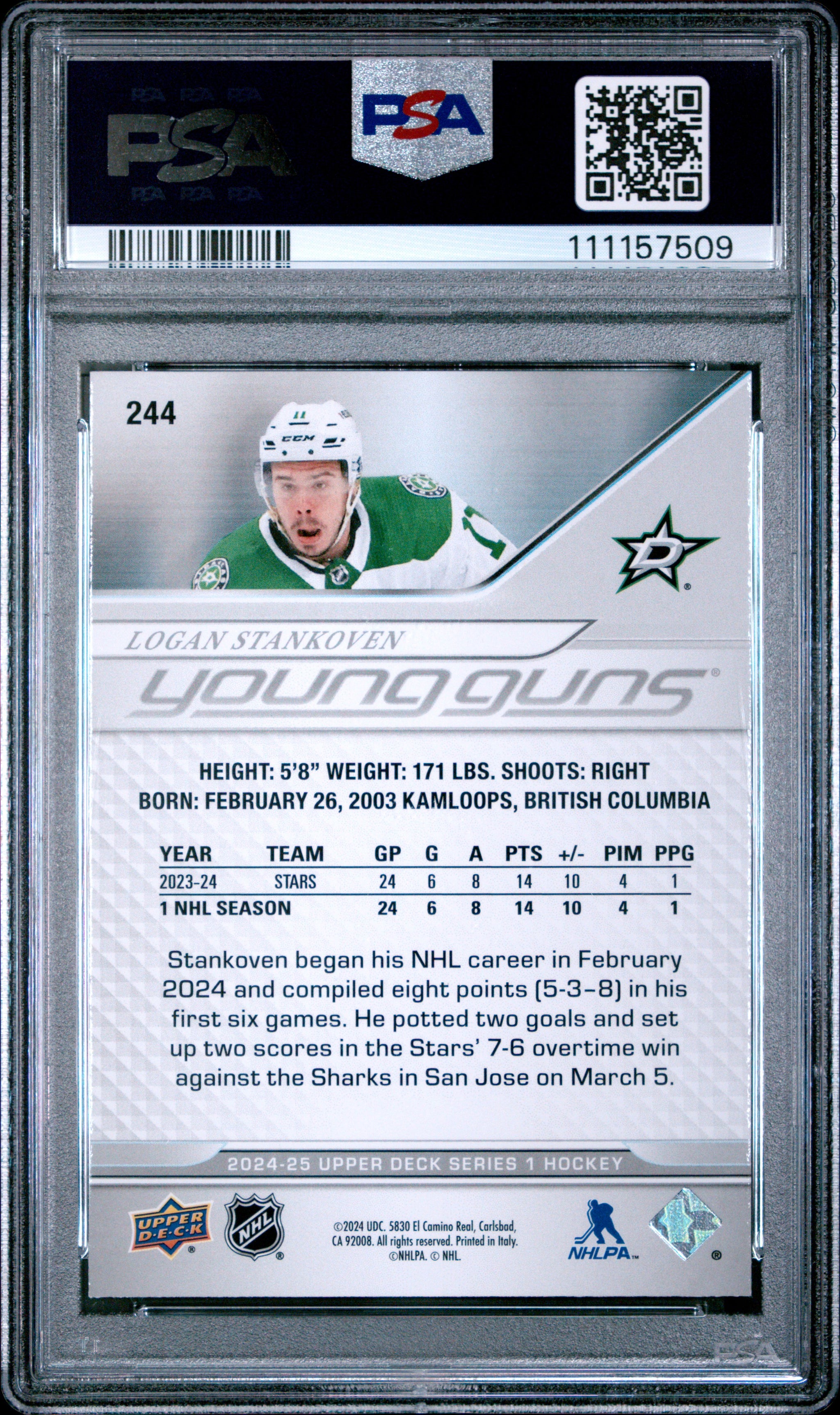 | *This is a Single Trading Card* | *Discounts are not available on Single Trading Cards* | This is a nice example of a 2024 Upper Deck #244 Logan Stankoven PSA 10 GEM MT. Please check out our other listings for more great cards. Thank you for your interest in one of our cards!!! Prior to making any bids/purchases, I would kindly ask you to read the information below: Item Condition Please see the provided pictures for the condition of the card or item, pictures of the front and back are provided for your review. We cannot accommodate requests for additional pictures. Any notable flaws or damage to this item will be noted in this listing. Please use the attached photos provided for your own assessment. Graded card cases may come with some minor wear/tear, surface scratch, chipped, or blemish. There are no partial refunds or returns because of the case condition. All single cards will come in protective cases. If you purchase a listing that's sold as a lot it may come in snap cases or sealed in a team bag, and not all cards will be individually sleeved and top loaded in all lots. Raw cards are sold as such, with no guarantees of potential and/or expected grades. All cards are sold as is, with no returns or refunds. Listed With Mascot.