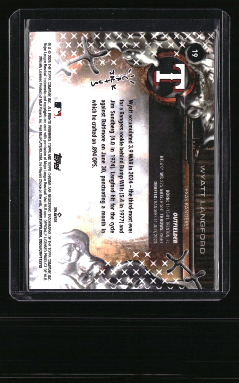 | *This is a Single Trading Card* | *Discounts are not available on Single Trading Cards* | This is a nice example of a 2025 Topps Cosmic Chrome x Cactus Jack #19 Wyatt Langford . Please check out our other listings for more great cards. Thank you for your interest in one of our cards!!! Prior to making any bids/purchases, I would kindly ask you to read the information below: Item Condition Please see the provided pictures for the condition of the card or item, pictures of the front and back are provided for your review. We cannot accommodate requests for additional pictures. Any notable flaws or damage to this item will be noted in this listing. Please use the attached photos provided for your own assessment. Graded card cases may come with some minor wear/tear, surface scratch, chipped, or blemish. There are no partial refunds or returns because of the case condition. All single cards will come in protective cases. If you purchase a listing that's sold as a lot it may come in snap cases or sealed in a team bag, and not all cards will be individually sleeved and top loaded in all lots. Raw cards are sold as such, with no guarantees of potential and/or expected grades. All cards are sold as is, with no returns or refunds. Listed With Mascot.