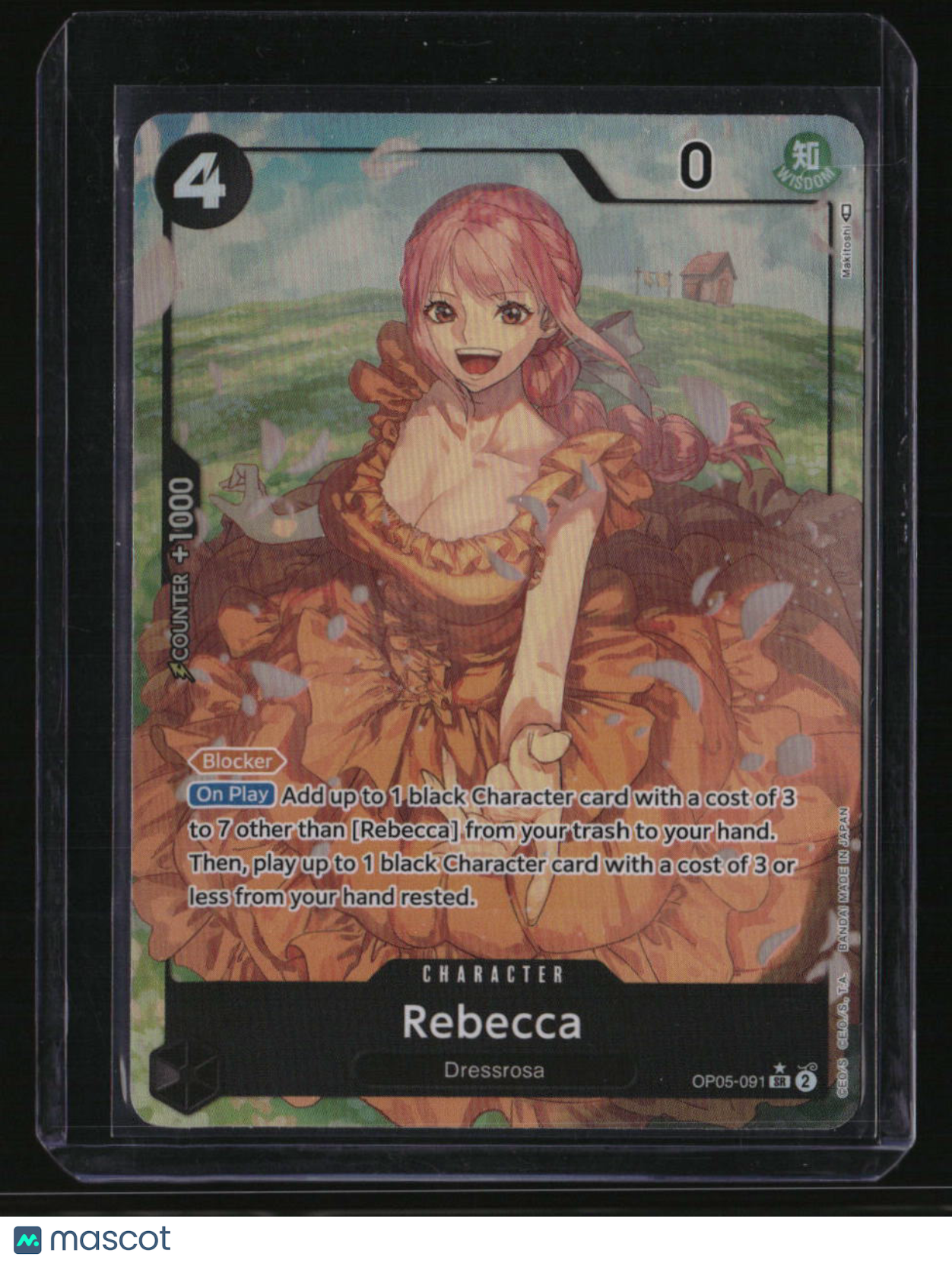 | *This is a Single Trading Card* | *Discounts are not available on Single Trading Cards* | This is a nice example of a Awakening of the New Era #OP05-091 Rebecca (Alternate Art) Super Rare. Please check out our other listings for more great cards. Thank you for your interest in one of our cards!!! Prior to making any bids/purchases, I would kindly ask you to read the information below: Item Condition Please see the provided pictures for the condition of the card or item, pictures of the front and back are provided for your review. We cannot accommodate requests for additional pictures. Any notable flaws or damage to this item will be noted in this listing. Please use the attached photos provided for your own assessment. Graded card cases may come with some minor wear/tear, surface scratch, chipped, or blemish. There are no partial refunds or returns because of the case condition. All single cards will come in protective cases. If you purchase a listing that's sold as a lot it may come in snap cases or sealed in a team bag, and not all cards will be individually sleeved and top loaded in all lots. Raw cards are sold as such, with no guarantees of potential and/or expected grades. All cards are sold as is, with no returns or refunds. Listed With Mascot.