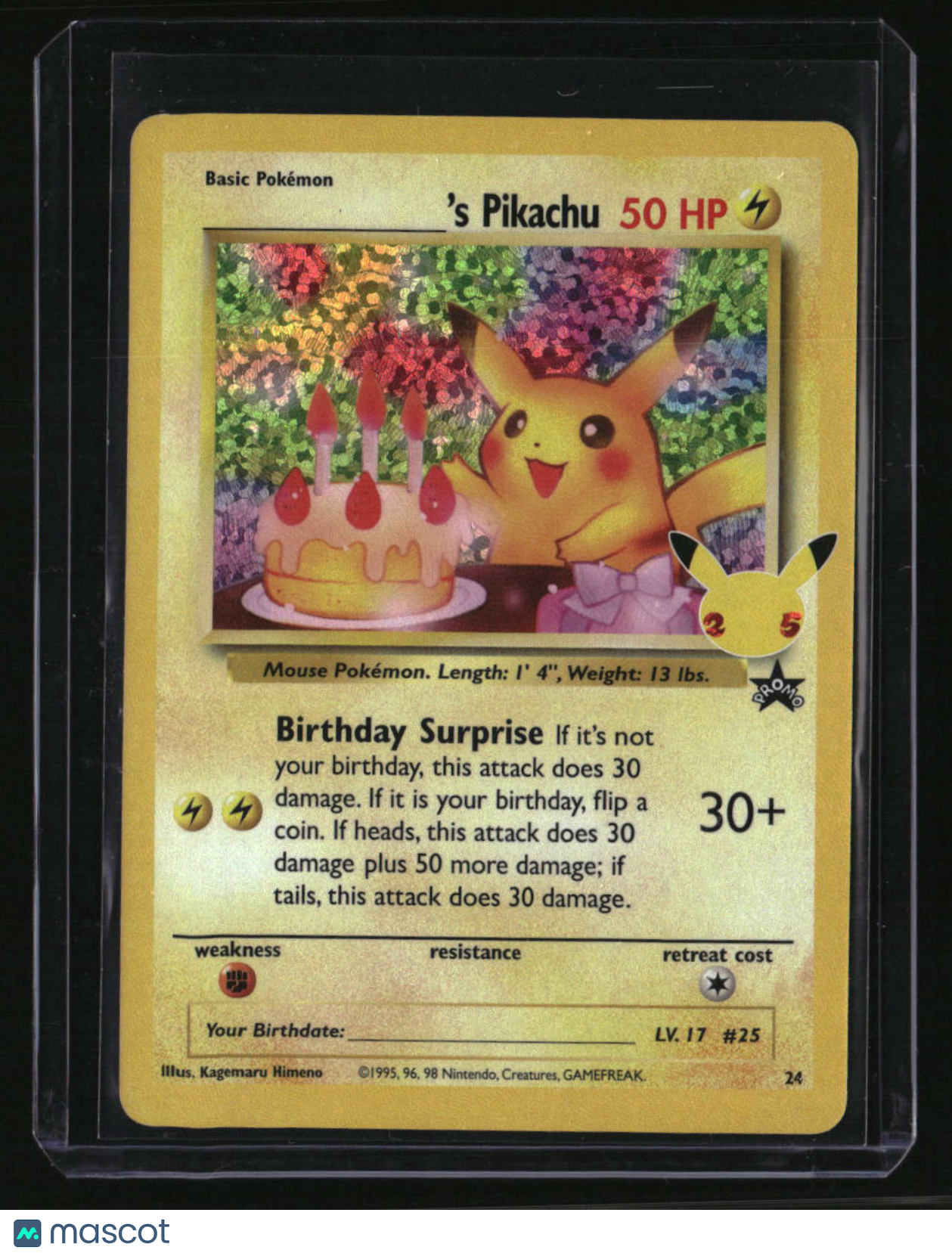 | *This is a Single Trading Card* | *Discounts are not available on Single Trading Cards* | This is a nice example of a Celebrations: Classic Collection #24/53 ______'s Pikachu Classic Collection. Please check out our other listings for more great cards. Thank you for your interest in one of our cards!!! Prior to making any bids/purchases, I would kindly ask you to read the information below: Item Condition Please see the provided pictures for the condition of the card or item, pictures of the front and back are provided for your review. We cannot accommodate requests for additional pictures. Any notable flaws or damage to this item will be noted in this listing. Please use the attached photos provided for your own assessment. Graded card cases may come with some minor wear/tear, surface scratch, chipped, or blemish. There are no partial refunds or returns because of the case condition. All single cards will come in protective cases. If you purchase a listing that's sold as a lot it may come in snap cases or sealed in a team bag, and not all cards will be individually sleeved and top loaded in all lots. Raw cards are sold as such, with no guarantees of potential and/or expected grades. All cards are sold as is, with no returns or refunds. Listed With Mascot.