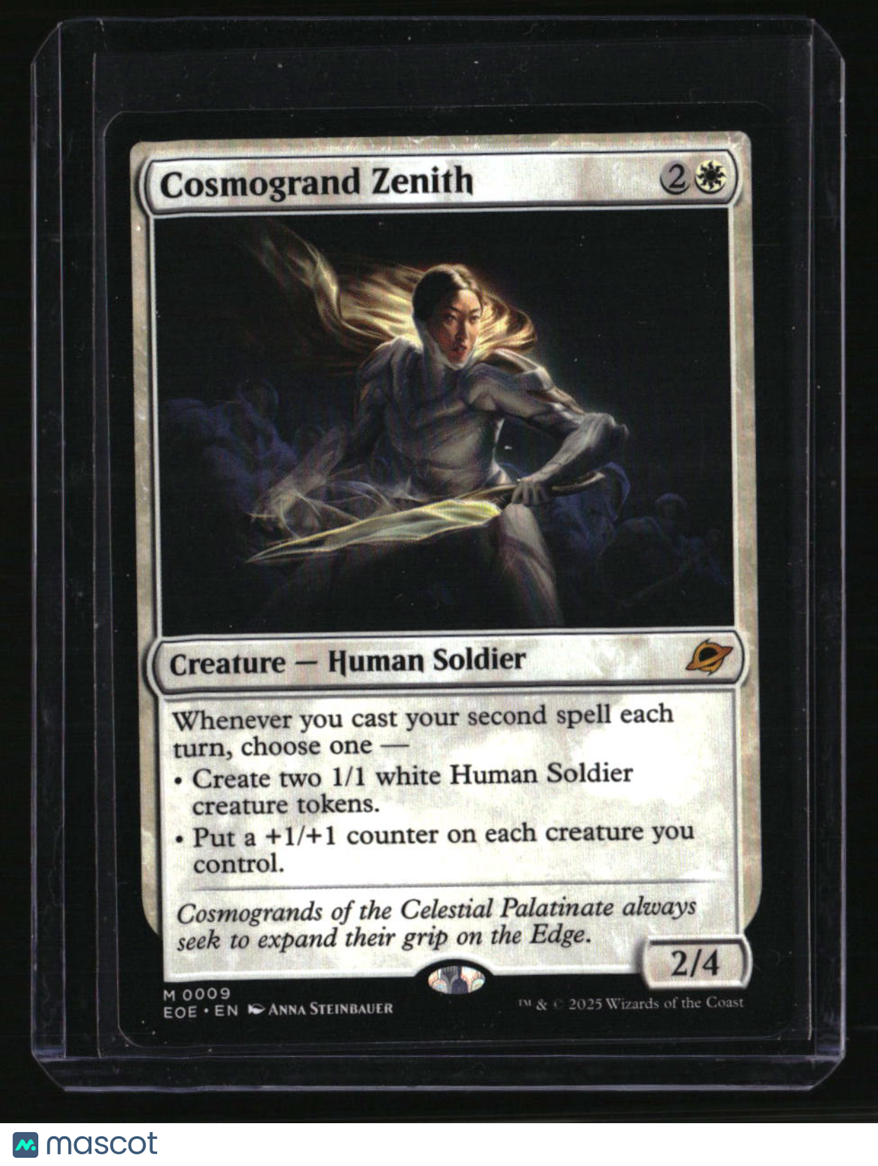| *This is a Single Trading Card* | *Discounts are not available on Single Trading Cards* | This is a nice example of a Edge of Eternities #9 Cosmogrand Zenith Mythic. Please check out our other listings for more great cards. Thank you for your interest in one of our cards!!! Prior to making any bids/purchases, I would kindly ask you to read the information below: Item Condition Please see the provided pictures for the condition of the card or item, pictures of the front and back are provided for your review. We cannot accommodate requests for additional pictures. Any notable flaws or damage to this item will be noted in this listing. Please use the attached photos provided for your own assessment. Graded card cases may come with some minor wear/tear, surface scratch, chipped, or blemish. There are no partial refunds or returns because of the case condition. All single cards will come in protective cases. If you purchase a listing that's sold as a lot it may come in snap cases or sealed in a team bag, and not all cards will be individually sleeved and top loaded in all lots. Raw cards are sold as such, with no guarantees of potential and/or expected grades. All cards are sold as is, with no returns or refunds. Listed With Mascot.