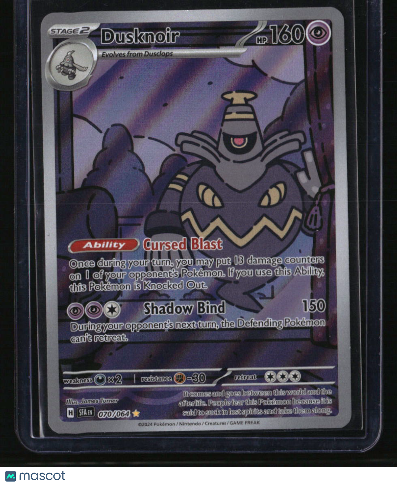 | *This is a Single Trading Card* | *Discounts are not available on Single Trading Cards* | This is a nice example of a SV: Shrouded Fable #070/064 Dusknoir . Please check out our other listings for more great cards. Thank you for your interest in one of our cards!!! Prior to making any bids/purchases, I would kindly ask you to read the information below: Item Condition Please see the provided pictures for the condition of the card or item, pictures of the front and back are provided for your review. We cannot accommodate requests for additional pictures. Any notable flaws or damage to this item will be noted in this listing. Please use the attached photos provided for your own assessment. Graded card cases may come with some minor wear/tear, surface scratch, chipped, or blemish. There are no partial refunds or returns because of the case condition. All single cards will come in protective cases. If you purchase a listing that's sold as a lot it may come in snap cases or sealed in a team bag, and not all cards will be individually sleeved and top loaded in all lots. Raw cards are sold as such, with no guarantees of potential and/or expected grades. All cards are sold as is, with no returns or refunds. Listed With Mascot.