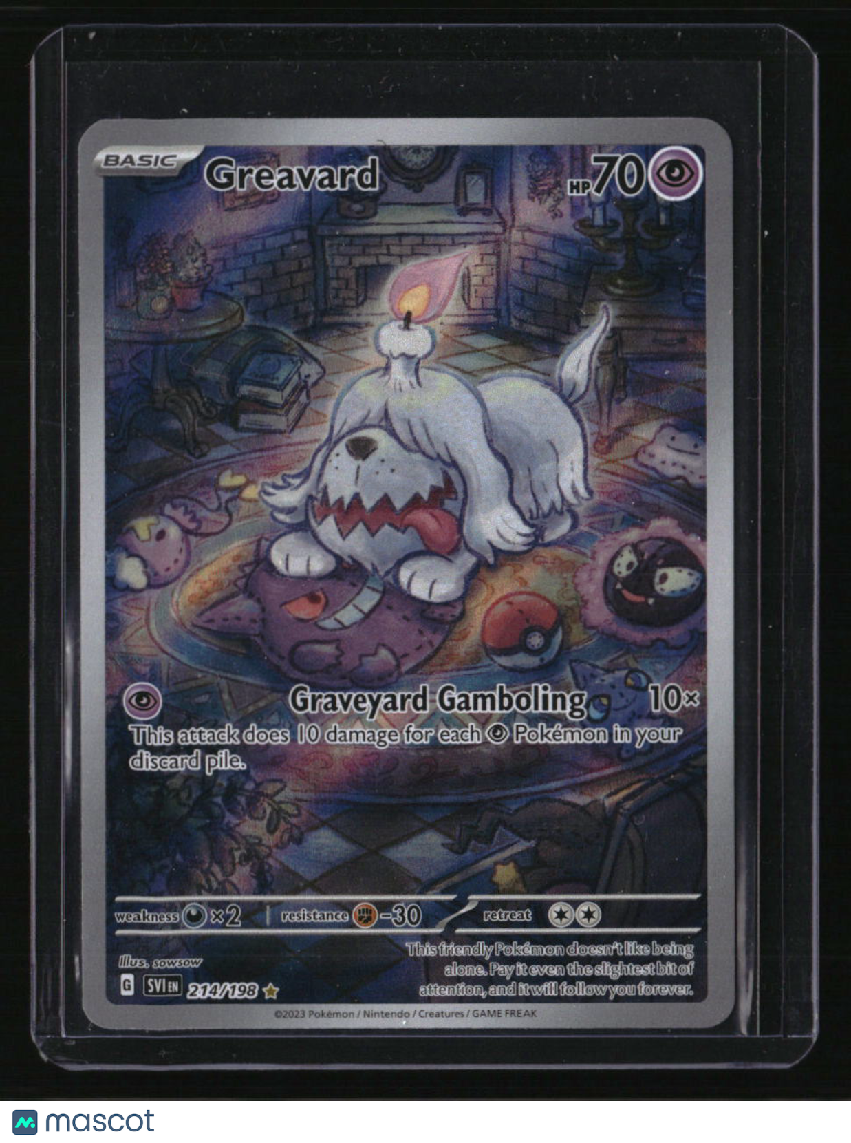 | *This is a Single Trading Card* | *Discounts are not available on Single Trading Cards* | This is a nice example of a SV01: Scarlet & Violet Base Set #214/198 Greavard . Please check out our other listings for more great cards. Thank you for your interest in one of our cards!!! Prior to making any bids/purchases, I would kindly ask you to read the information below: Item Condition Please see the provided pictures for the condition of the card or item, pictures of the front and back are provided for your review. We cannot accommodate requests for additional pictures. Any notable flaws or damage to this item will be noted in this listing. Please use the attached photos provided for your own assessment. Graded card cases may come with some minor wear/tear, surface scratch, chipped, or blemish. There are no partial refunds or returns because of the case condition. All single cards will come in protective cases. If you purchase a listing that's sold as a lot it may come in snap cases or sealed in a team bag, and not all cards will be individually sleeved and top loaded in all lots. Raw cards are sold as such, with no guarantees of potential and/or expected grades. All cards are sold as is, with no returns or refunds. Listed With Mascot.