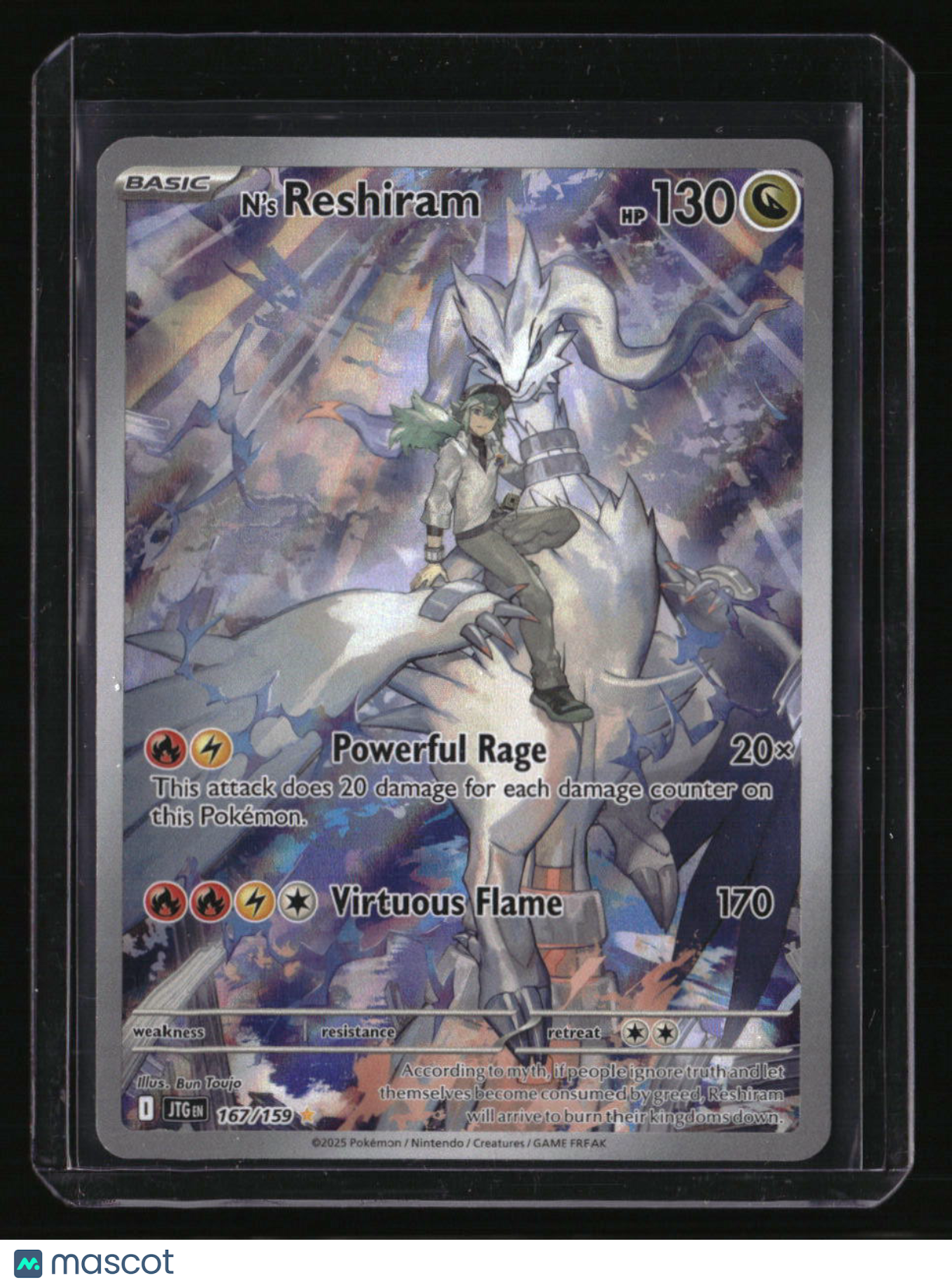 | *This is a Single Trading Card* | *Discounts are not available on Single Trading Cards* | This is a nice example of a SV09: Journey Together #167/159 N's Reshiram . Please check out our other listings for more great cards. Thank you for your interest in one of our cards!!! Prior to making any bids/purchases, I would kindly ask you to read the information below: Item Condition Please see the provided pictures for the condition of the card or item, pictures of the front and back are provided for your review. We cannot accommodate requests for additional pictures. Any notable flaws or damage to this item will be noted in this listing. Please use the attached photos provided for your own assessment. Graded card cases may come with some minor wear/tear, surface scratch, chipped, or blemish. There are no partial refunds or returns because of the case condition. All single cards will come in protective cases. If you purchase a listing that's sold as a lot it may come in snap cases or sealed in a team bag, and not all cards will be individually sleeved and top loaded in all lots. Raw cards are sold as such, with no guarantees of potential and/or expected grades. All cards are sold as is, with no returns or refunds. Listed With Mascot.