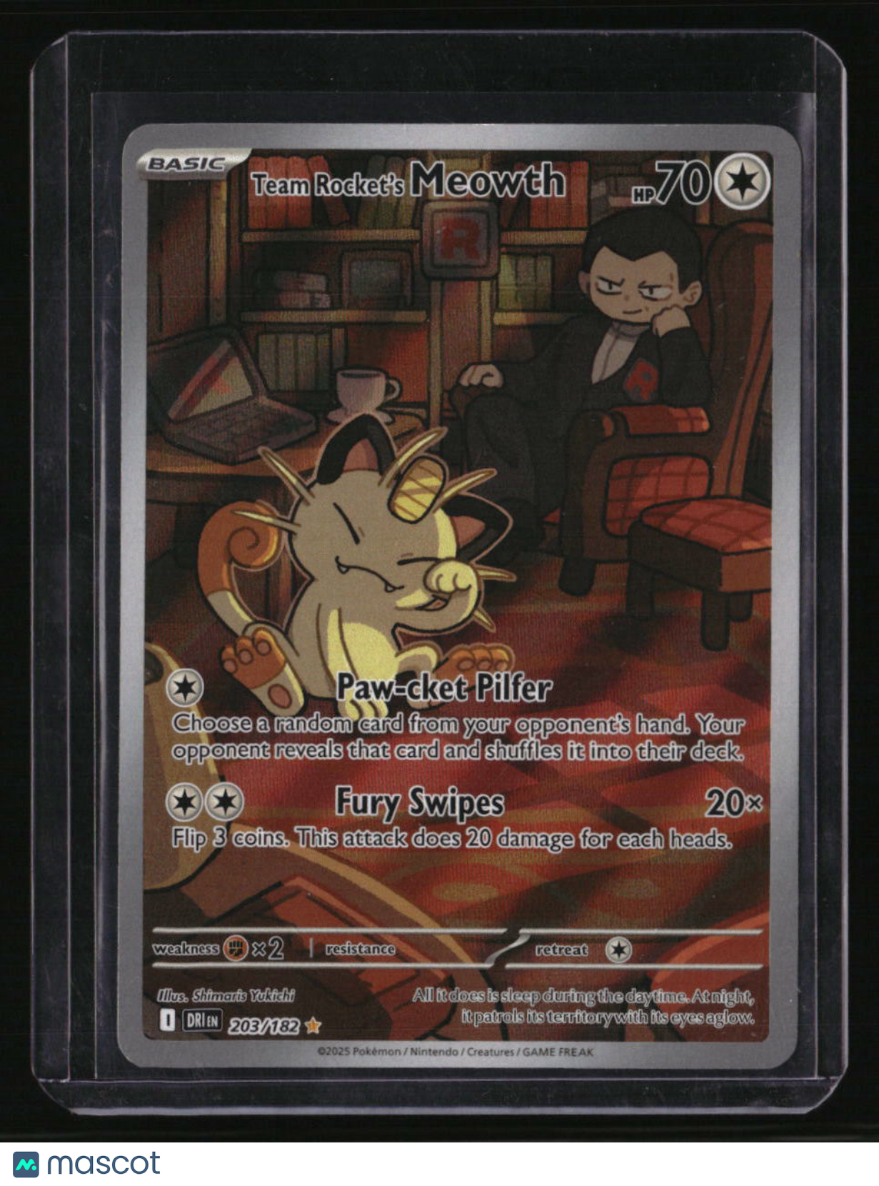 | *This is a Single Trading Card* | *Discounts are not available on Single Trading Cards* | This is a nice example of a SV10: Destined Rivals #203/182 Team Rocket's Meowth . Please check out our other listings for more great cards. Thank you for your interest in one of our cards!!! Prior to making any bids/purchases, I would kindly ask you to read the information below: Item Condition Please see the provided pictures for the condition of the card or item, pictures of the front and back are provided for your review. We cannot accommodate requests for additional pictures. Any notable flaws or damage to this item will be noted in this listing. Please use the attached photos provided for your own assessment. Graded card cases may come with some minor wear/tear, surface scratch, chipped, or blemish. There are no partial refunds or returns because of the case condition. All single cards will come in protective cases. If you purchase a listing that's sold as a lot it may come in snap cases or sealed in a team bag, and not all cards will be individually sleeved and top loaded in all lots. Raw cards are sold as such, with no guarantees of potential and/or expected grades. All cards are sold as is, with no returns or refunds. Listed With Mascot.