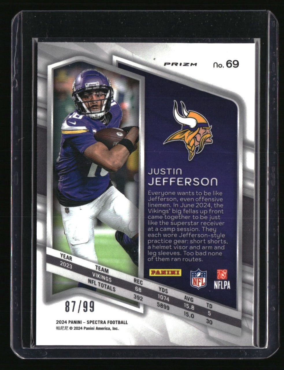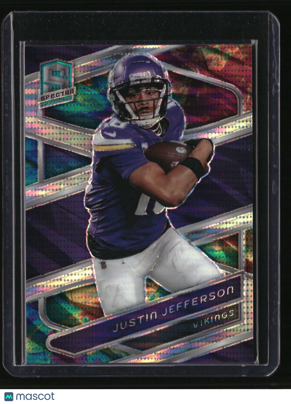 | *This is a Single Trading Card* | *Discounts are not available on Single Trading Cards* | This is a nice example of a 2024 Panini Spectra #69 Justin Jefferson Celestial SN. Please check out our other listings for more great cards. Thank you for your interest in one of our cards!!! Prior to making any bids/purchases, I would kindly ask you to read the information below: Item Condition Please see the provided pictures for the condition of the card or item, pictures of the front and back are provided for your review. We cannot accommodate requests for additional pictures. Any notable flaws or damage to this item will be noted in this listing. Please use the attached photos provided for your own assessment. Graded card cases may come with some minor wear/tear, surface scratch, chipped, or blemish. There are no partial refunds or returns because of the case condition. All single cards will come in protective cases. If you purchase a listing that's sold as a lot it may come in snap cases or sealed in a team bag, and not all cards will be individually sleeved and top loaded in all lots. Raw cards are sold as such, with no guarantees of potential and/or expected grades. All cards are sold as is, with no returns or refunds. Listed With Mascot.
