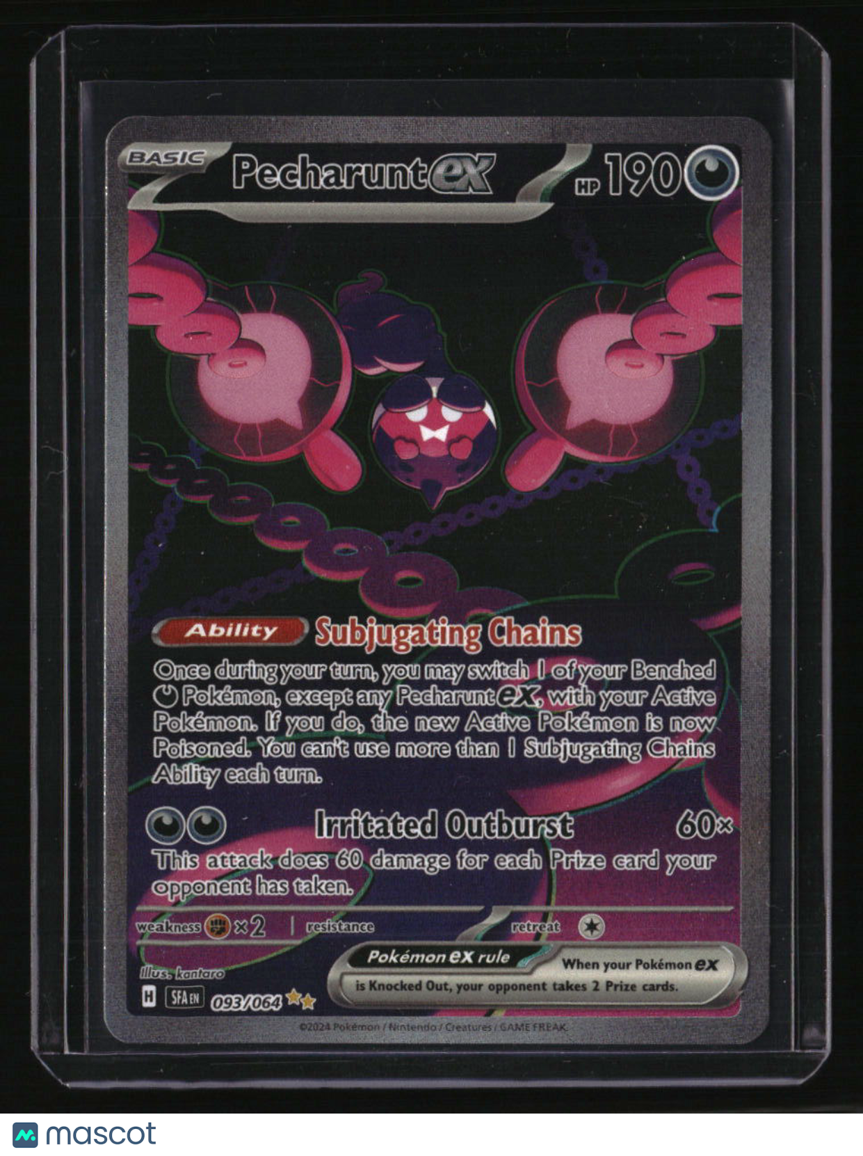 | *This is a Single Trading Card* | *Discounts are not available on Single Trading Cards* | This is a nice example of a SV: Shrouded Fable #093/064 Pecharunt ex . Please check out our other listings for more great cards. Thank you for your interest in one of our cards!!! Prior to making any bids/purchases, I would kindly ask you to read the information below: Item Condition Please see the provided pictures for the condition of the card or item, pictures of the front and back are provided for your review. We cannot accommodate requests for additional pictures. Any notable flaws or damage to this item will be noted in this listing. Please use the attached photos provided for your own assessment. Graded card cases may come with some minor wear/tear, surface scratch, chipped, or blemish. There are no partial refunds or returns because of the case condition. All single cards will come in protective cases. If you purchase a listing that's sold as a lot it may come in snap cases or sealed in a team bag, and not all cards will be individually sleeved and top loaded in all lots. Raw cards are sold as such, with no guarantees of potential and/or expected grades. All cards are sold as is, with no returns or refunds. Listed With Mascot.